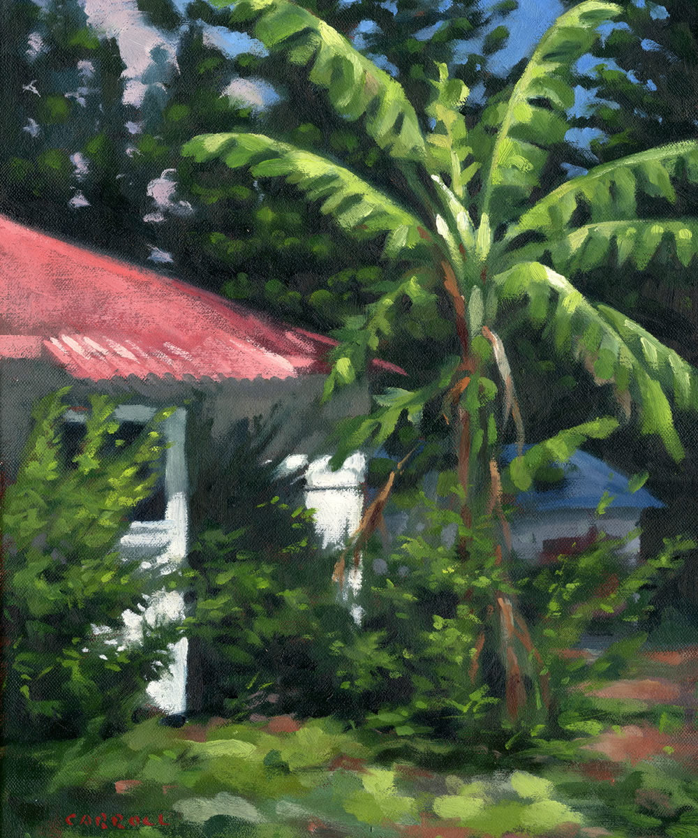 You know you’re in Hawaii when you see banana trees in places where an oak or maple would be on the Mainland! This is especially true on Lana’i, where banana trees are scattered throughout the the town. This one in particular intrigued me, as it’s nestled behind a vintage plantation-era building. The afternoon light glinting off the leaves is what first drew me to this scene, and the shop in the front of the building was called ‘Highlights’.