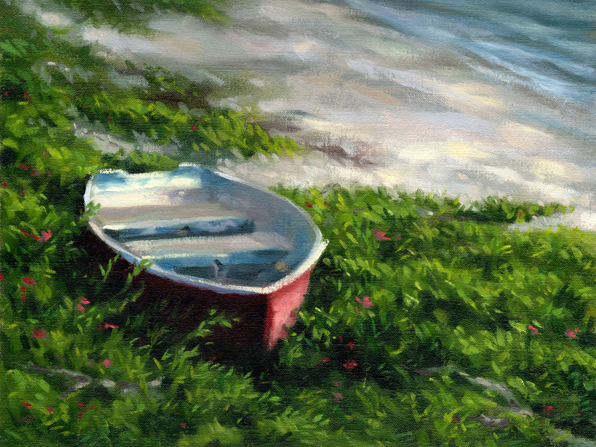 Walking along the beach at Crystal Cove, California, is like stepping back in time, which makes it a great locale for artists. On this particular day, there were over a dozen artists painting views of the houses on the bluff overlooking the beach, so I looked the other way and spotted this scene. The little rowboat had been sitting on the shore just long enough to let the flowering vines start climbing over the edge. When I saw the red boat against the green plants, I knew this was a scene that was ‘ready and waiting’ to be painted!