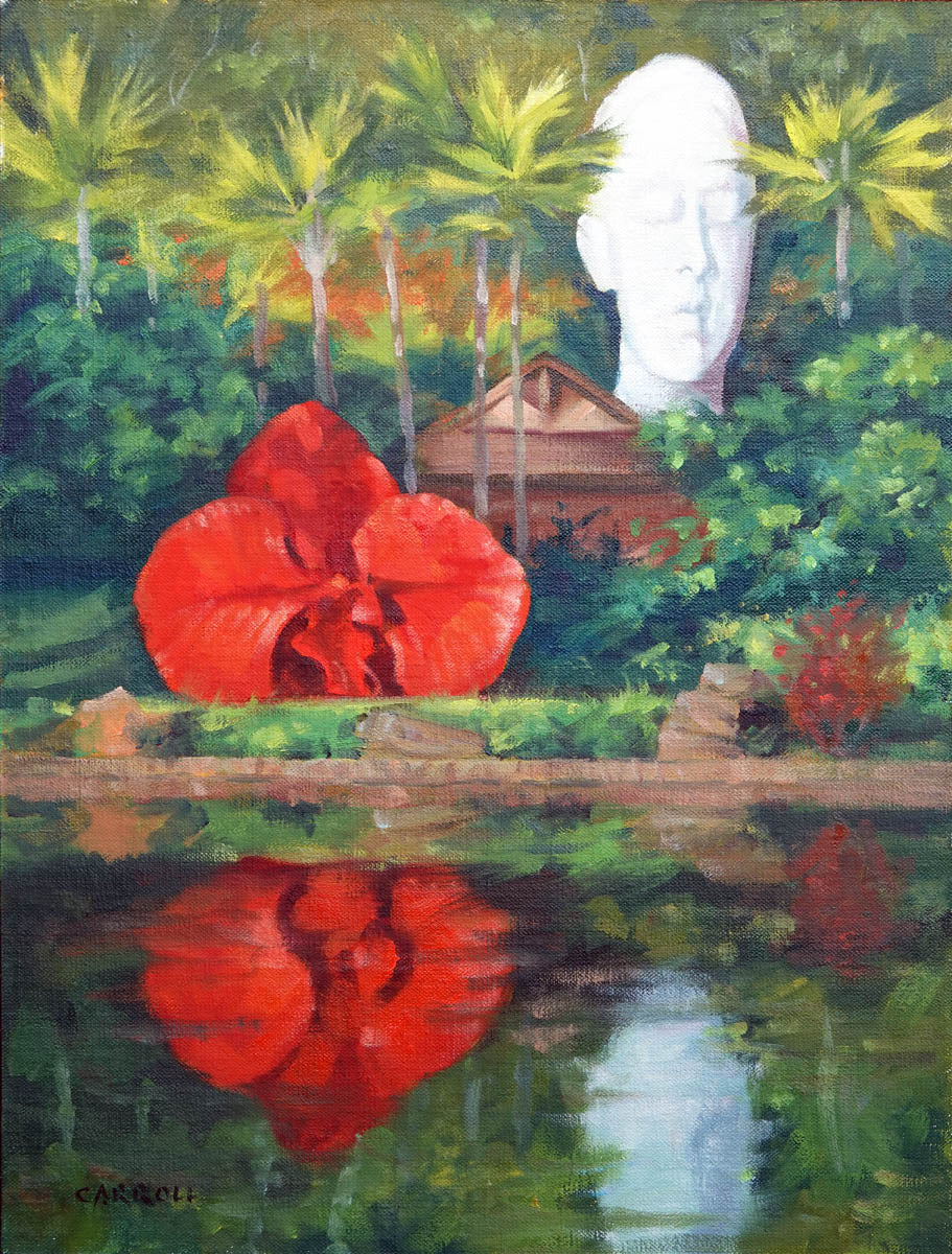 A tropical landscape with monumental sculptures by Marc Quinn and Jaume Plensa is reflected in the quiet pond of the Sensei Lana'i resort.
