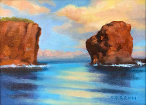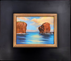 I painted Lanai's iconic landmark, Pu'upehe, in the warm light of late afternoon. Affectionately called "Sweetheart Rock", this towering sea stack is steeped in Hawaiian folklore. I hope this painting will bring back great memories to those who made the trek around Hulopo'e Bay to see it!