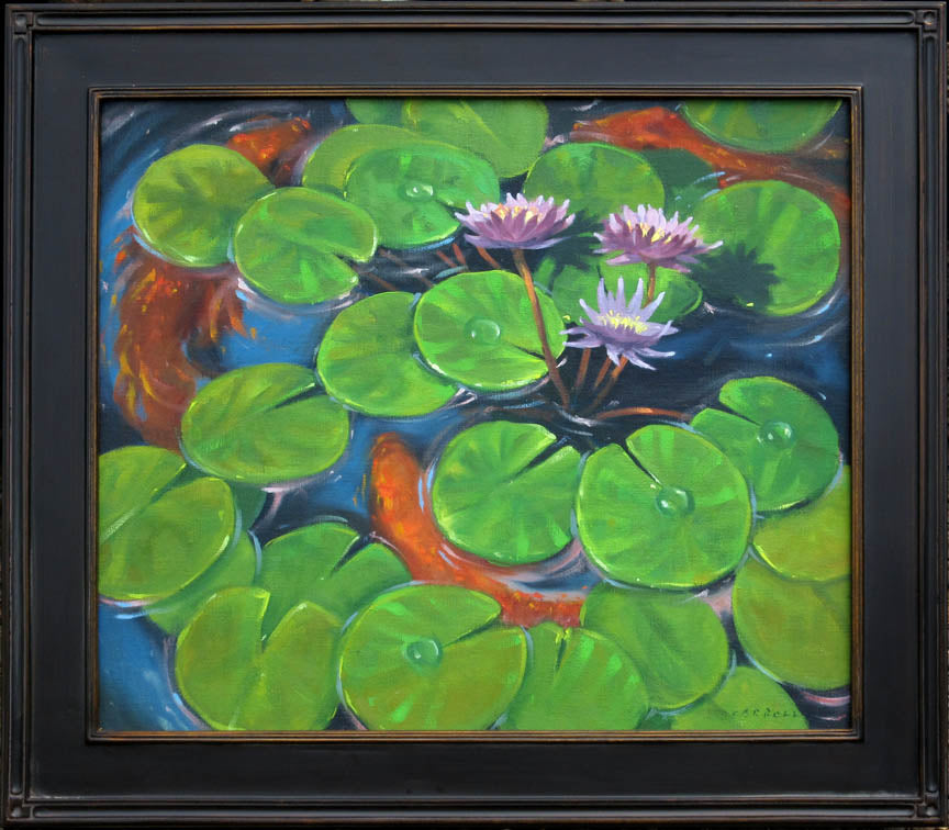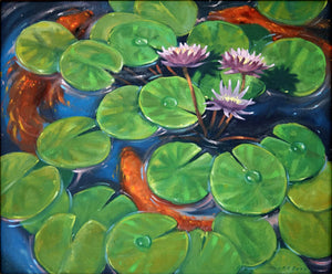 I love painting the movement of brightly colored koi fish in a still pond of lily pads!
