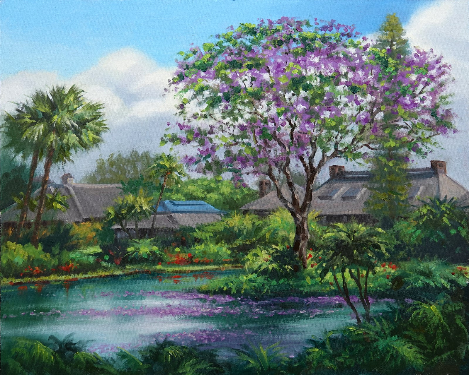 The gardens at Sensei Lana'i are mystical.  I found myself staring at the purple petals from the Jacaranda tree floating in the serene pond and immediately knew this would be the inspiration for my next painting!