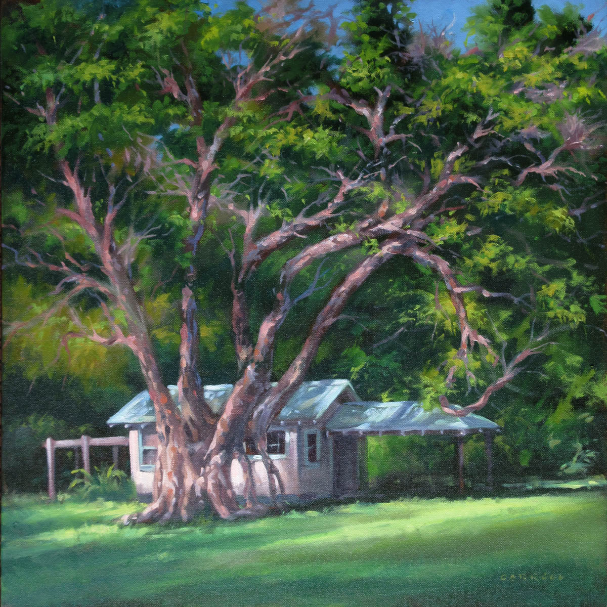A massive banyan tree in my neighbor's yard greets me daily. I especially like the play of afternoon light on the twisting branches.