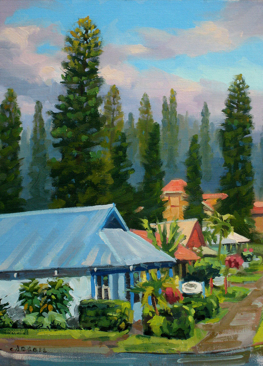 Another "only on Lana'i" scene!  I painted this live, en plein air, from the Blue Ginger Cafe looking up Seventh Street in Lana'i City.  The setting sun gives the towering Cook Pines and plantation-era buildings a wonderful, warm glow.