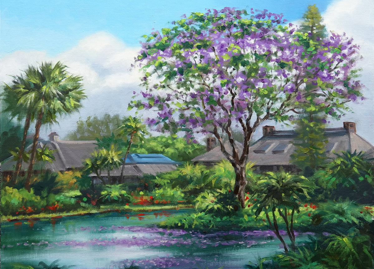 The gardens of the Sensei Resort are magnificent...after staring at the purple petals of this Jacaranda tree floating on the serene pond, I knew I'd found the inspiration for a painting!