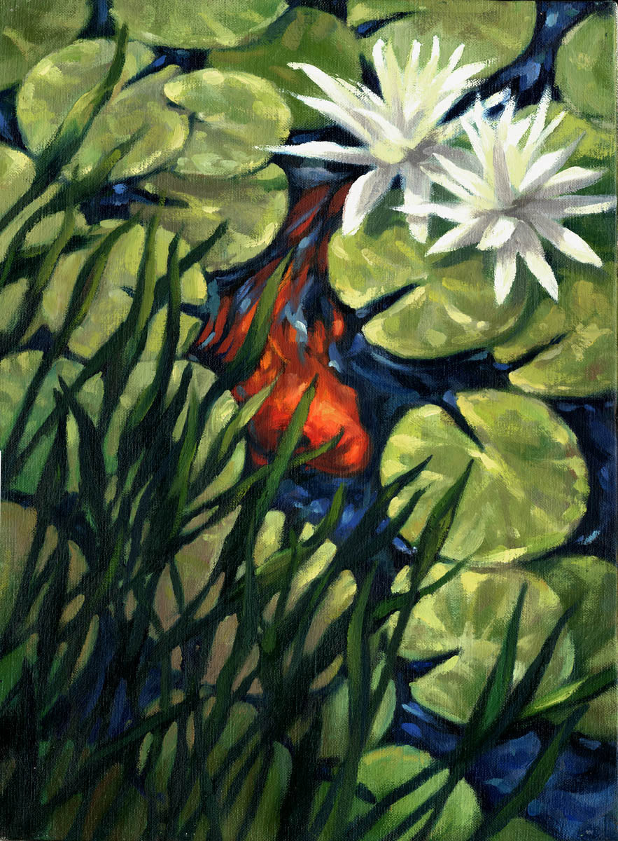 I can't resist painting the warm colors of koi fish darting among the cool greens of lily pads!