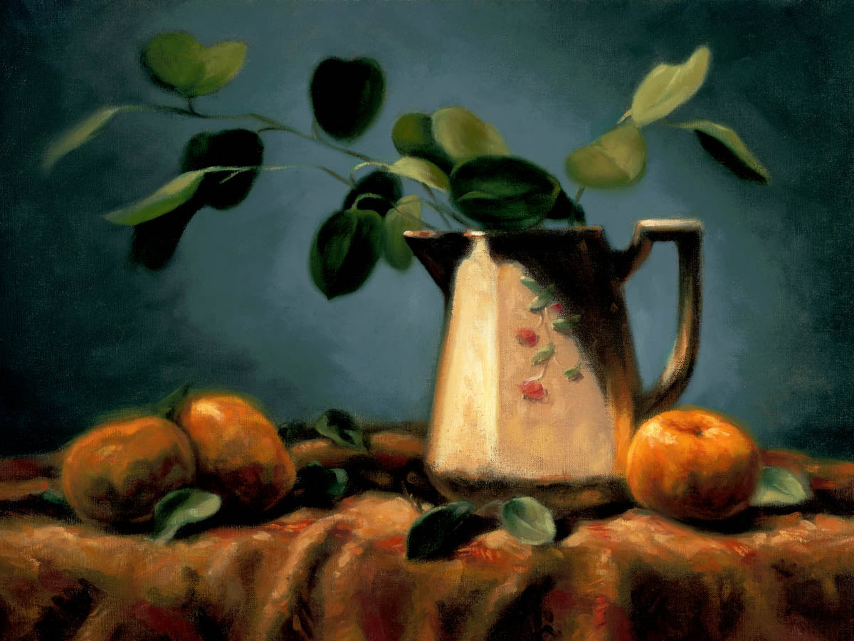 One of our markets had a simple fruit display labeled "Local Tangerines"... I added an antique Japanese pitcher, a sprig of greenery from the Munro Trail, and a tapestry cloth and started painting this serene still life.