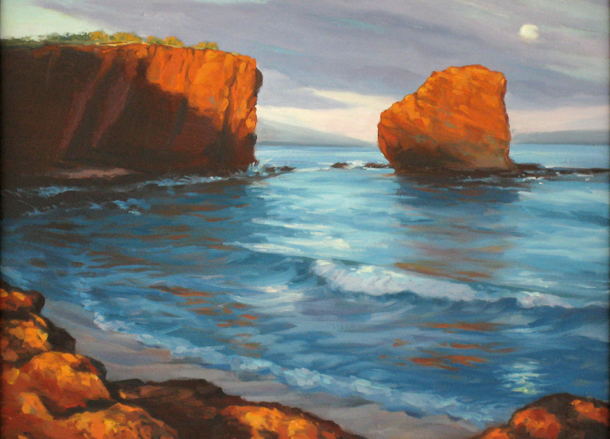 There's one day every month where the full moon rises as the sun is setting. I painted a small plein air canvas on the cliff above Sharks' Cove to serve as a color study for a larger piece.