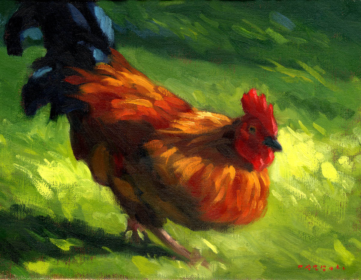 I did a couple of paintings of roosters and hens that were living in the woods near the golf course.  At dawn I got down on my hands and knees to lure the birds into patches of sunlight with chickenfeed.  After a while, I had to laugh...if you had told me years ago in Chicago that one day I'd be calling chickens in Hawaii, I would have said you were nuts!  Such is life.
