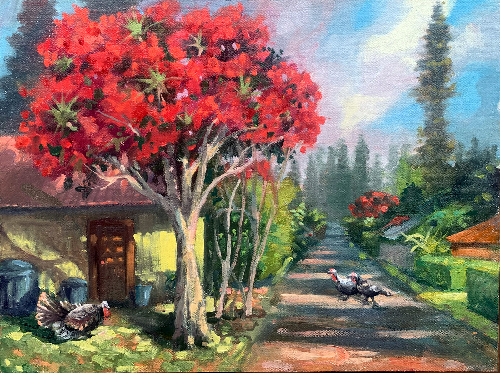 One of the many quirks on Lana'i is the number of wild turkeys roaming our parks, streets, and lawns.  I have to laugh when I see them congregating, especially when the "turkey holidays" get closer (and "no" I've never seen one served on a dinner platter here!) I painted this on Palawai Street to honor the ancient bougainvillea that was recently taken down.