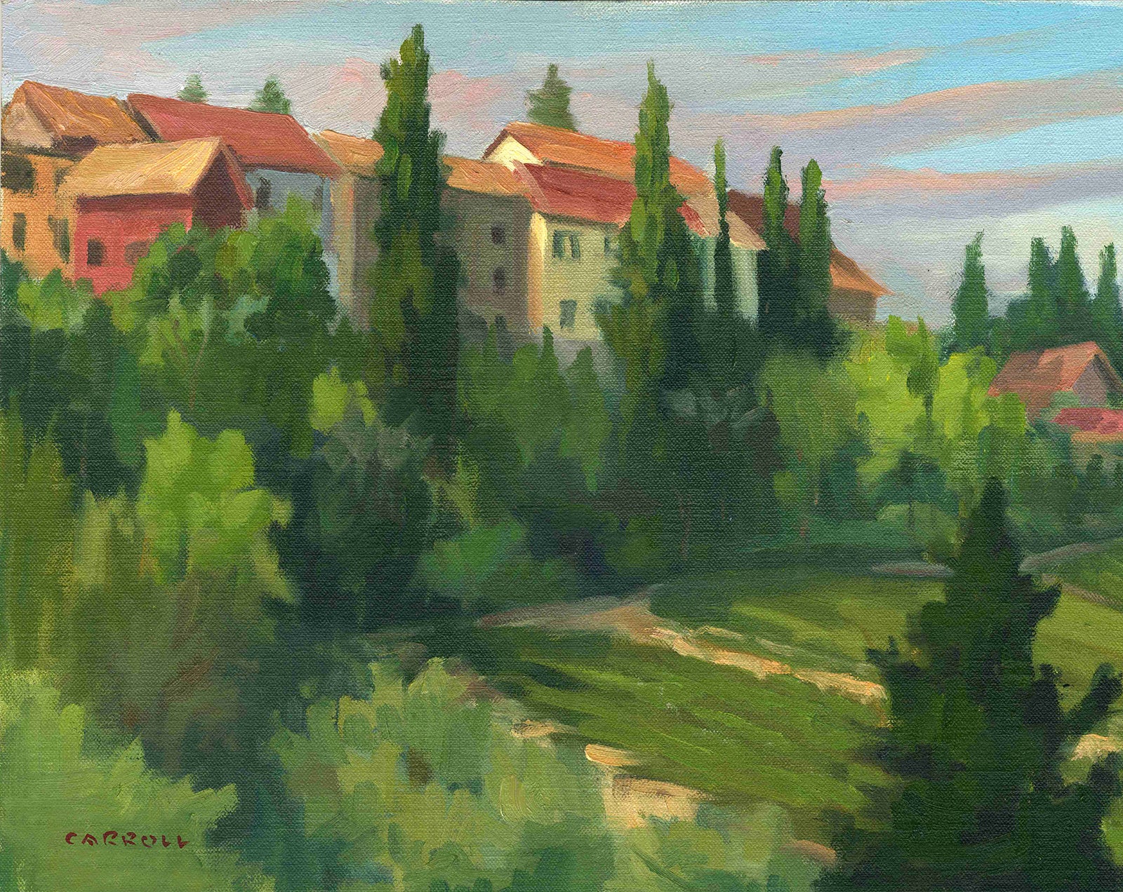 Just outside of Siena is a quaint Tuscan village--I painted this scene from an overlook behind the town.  The vineyards, olive trees, and vintage architecture were so enticing to paint!
