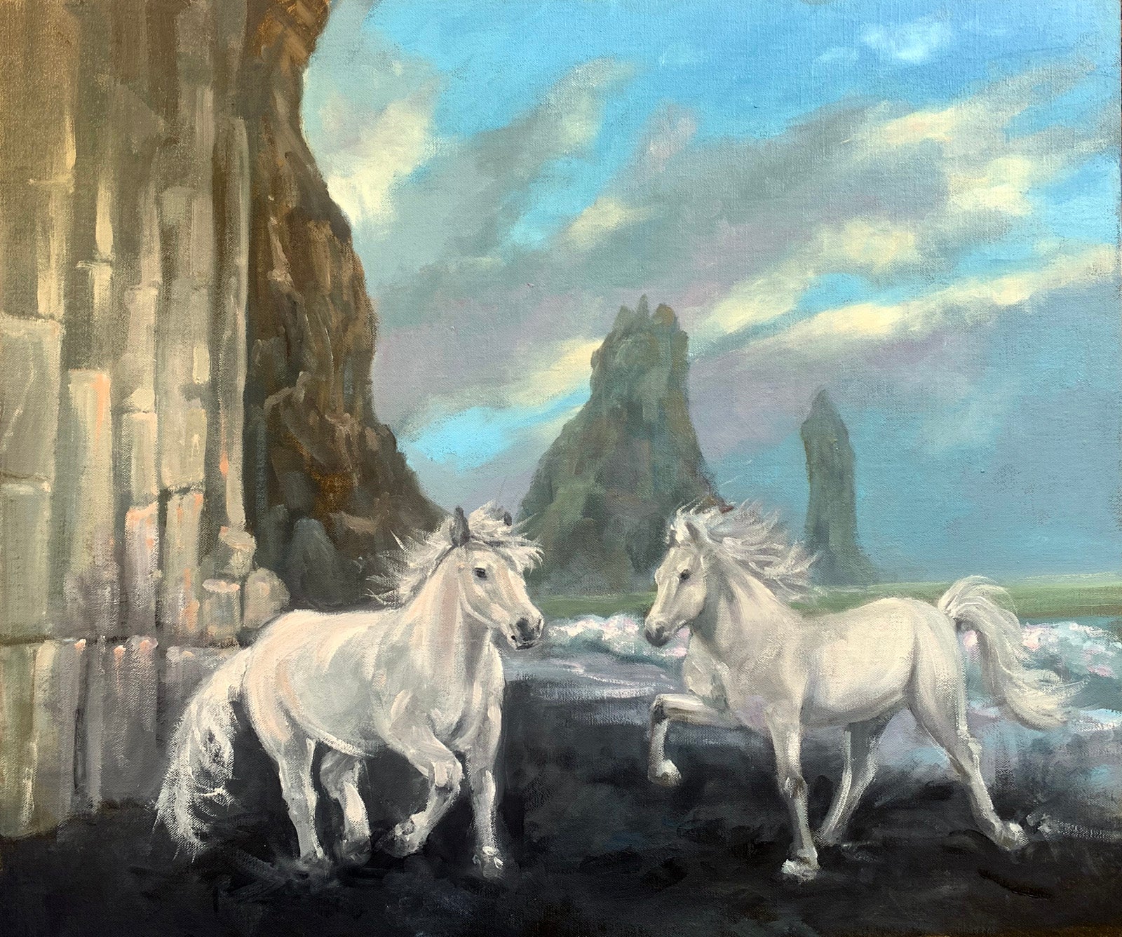 Iceland's famous black sand beach, Reynisfjara, served as the locale for this painting.  The basalt crystal columns and turbulent sky add to the drama.  This is a "dreamscape"--while Icelandic horses do run on this beach, there were none when we visited.  Luckily, I'd kept the dues on my "Artistic License" up to date!